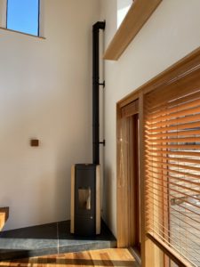 玄関から見える、高い吹き抜け吹き抜けとストーンストーブ