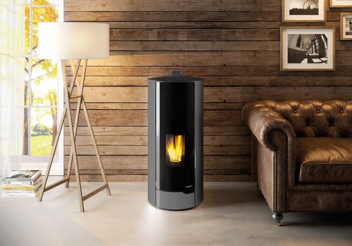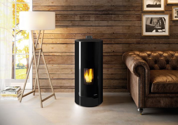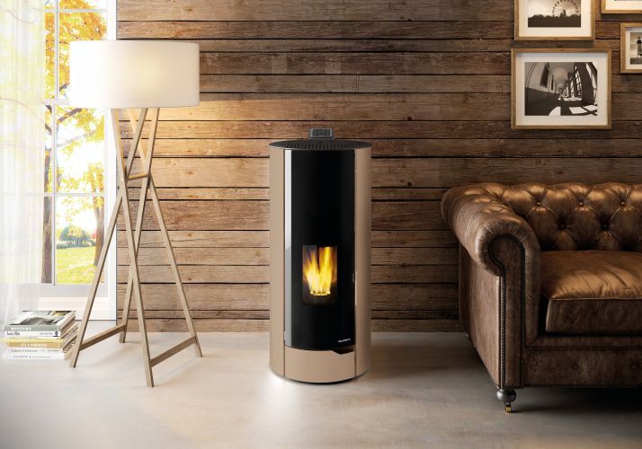 全面扉に大型の曲面ガラスを使用したモデル。すっきりと仕上げつつ、ボリューム感のある丸柱型デザインです。温風は上方から送り出します。扉が二重になっているので、前面が熱くなり過ぎず設置場所を選ばないのがいいですね。サイレント運転、セラミック着火ヒーター、スターバルブ搭載など、機能が充実しています。